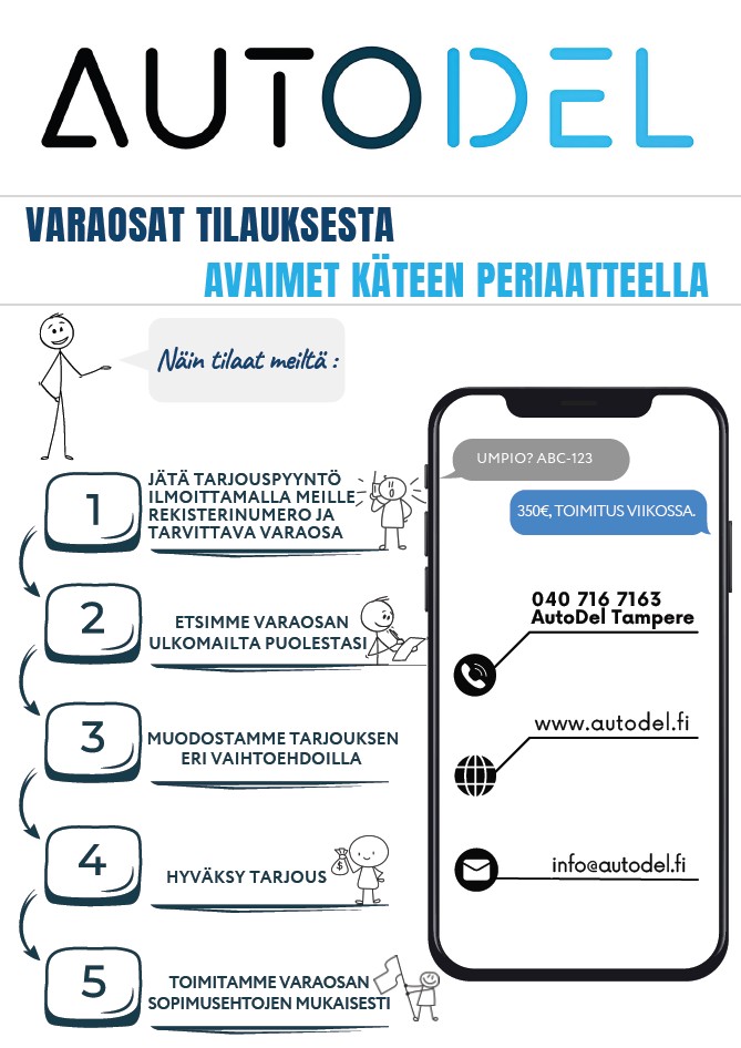Varaosien hankinnan ulkoistamisella AutoDel Oy:lle säästät siis aikaa ja rahaa. Kysy varaosista rohkeasti